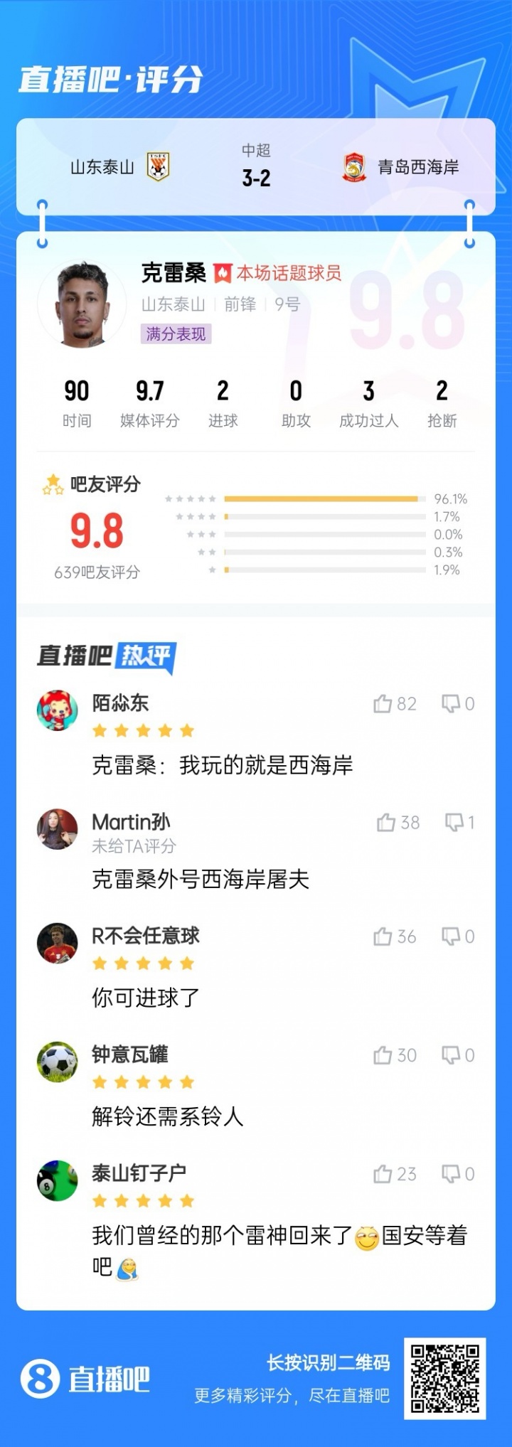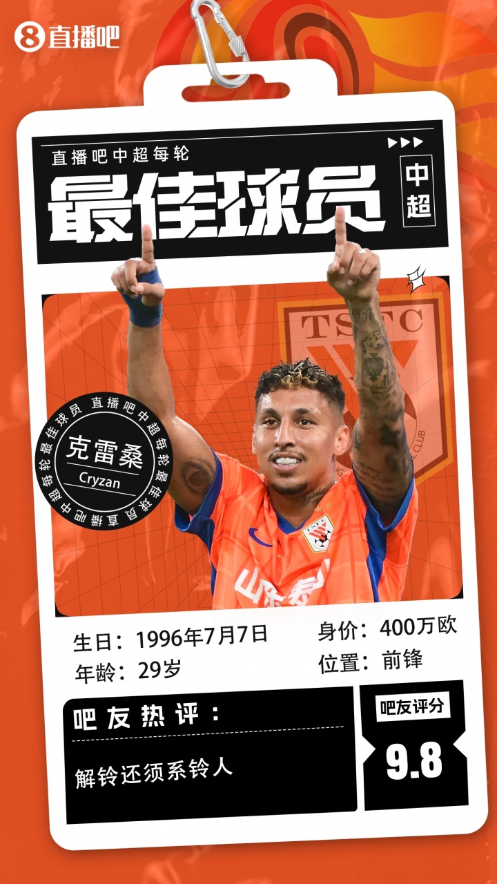 【】中超第二轮最佳:克雷桑毫无悬念当选,评分高达9.9!